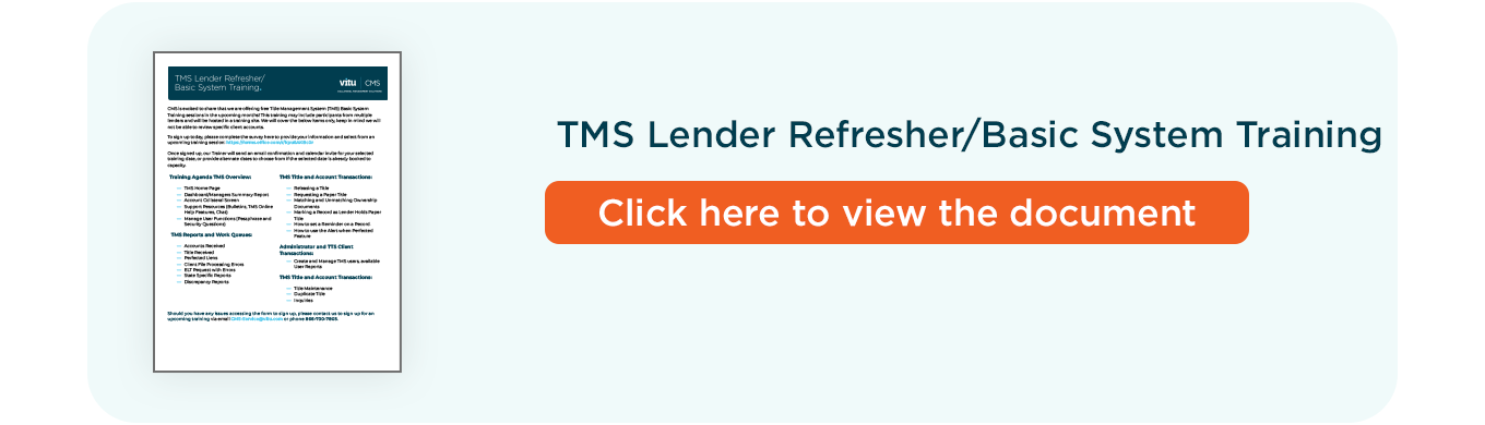 CMS is excited to share that we are offering free Title Management System (TMS) Basic System Training sessions in the upcoming months! For more details on what’s covered and to sign up, please click view the handout, below.