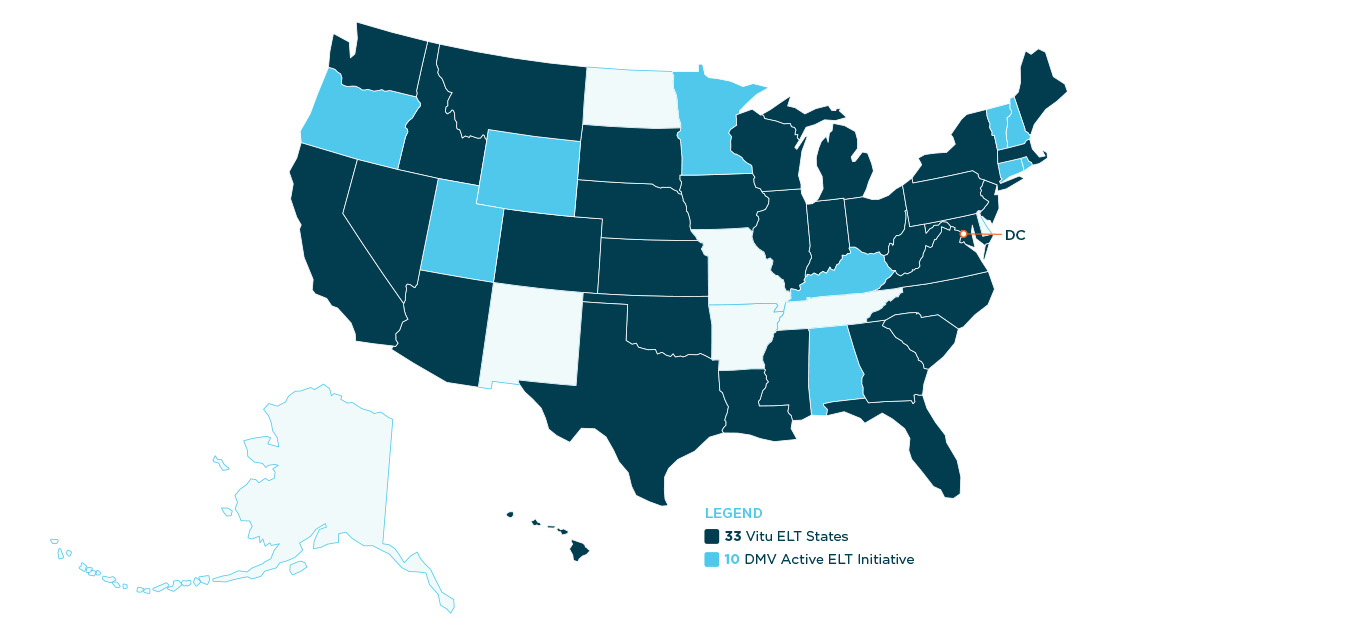 Vitu is here to support your financial institution through expansion of ELT adoption across the nation. Our commitment and coordination with jurisdictions puts us at the forefront of new initiatives and requirements, keeping you — our partner — one step ahead of any changes and in compliance with state regulations.