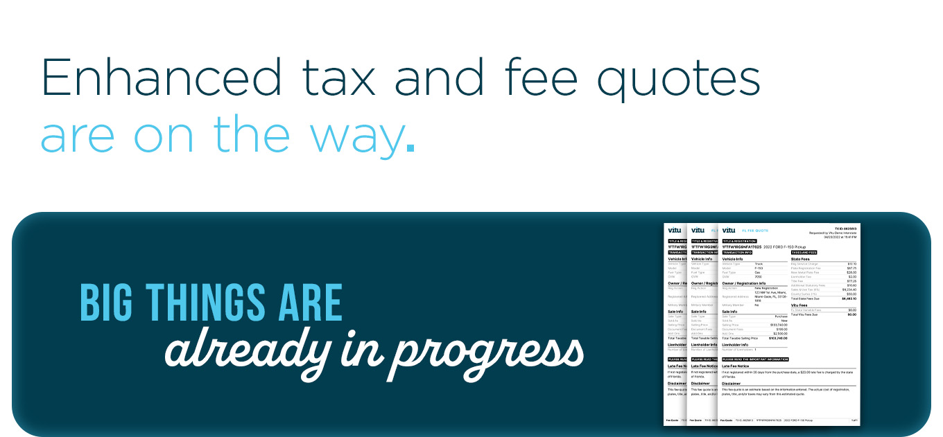 In our efforts to provide best-in-class tools and functionality, we are hard at work developing and implementing improved Tax and Fee estimators within Vitu Interstate. These enhanced calculators incorporate both current tax and fee rates, but also new and improved functionality, including: