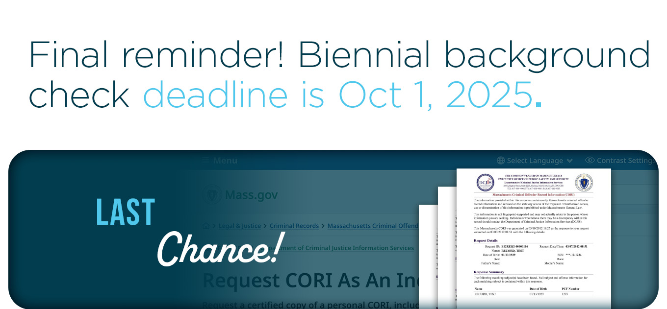For your continued access and compliance with Massachusetts RMV EVR policies, you are required to submit updated User Documents at least every two years to your Service Provider (that's us). If you have not already done so, please submit your documents to RTSForms@vitu.com. The deadline to submit documents is October 1, 2025. Users who have not submitted updated documents will be deactivated. For more information on obtaining a background check, click the link below.