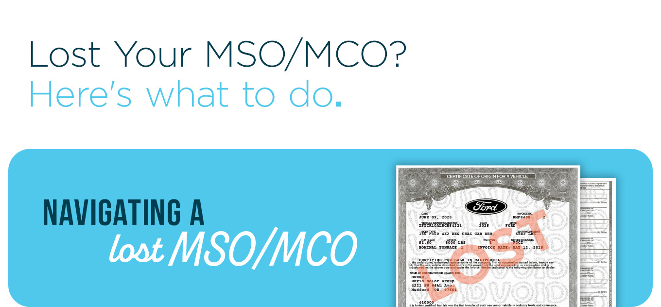 We get it — paperwork can wander off sometimes. If you’re dealing with a lost or missing Manufacturer’s Statement of Origin (MSO) or Certificate of Origin (MCO), don’t worry — we’ve got a backup plan!