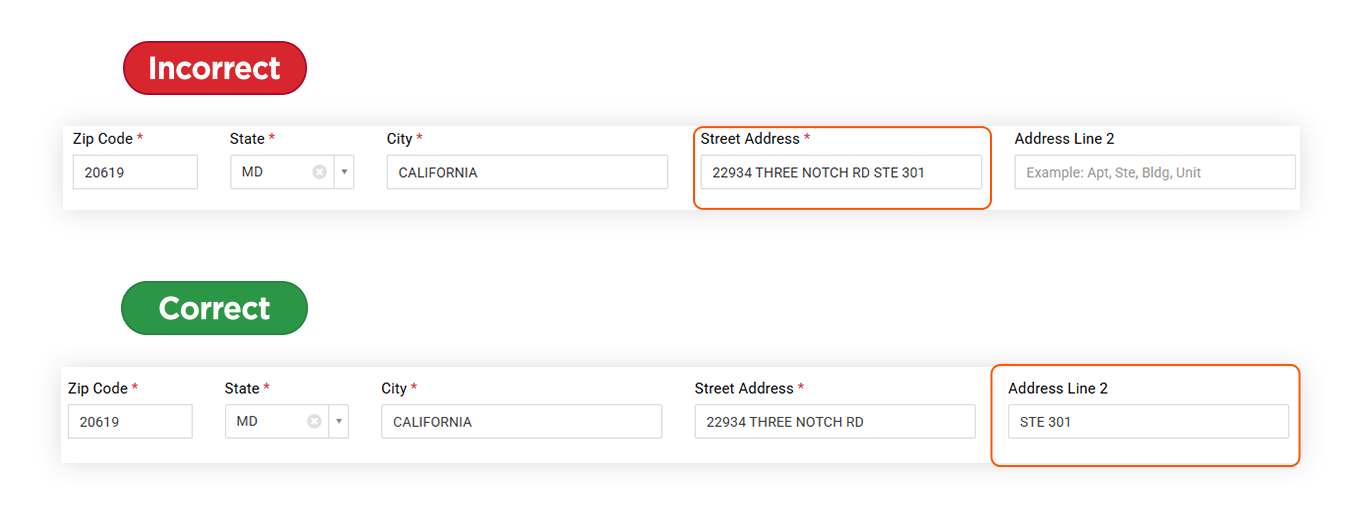 - Address Line 2: Use only for multi-unit details, such as Apt, Ste, Bldg, or Unit numbers.