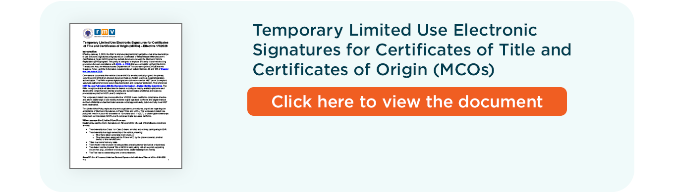 Effective January 1, 2026, the RMV is implementing temporary guidelines that allow dealerships to use Electronic Signatures (eSignatures) on Certificates of Title (Title) and Manufacturer’s Certificates of Origin (MCO) when they submit documents through the Electronic Vehicle Registration (EVR) program.