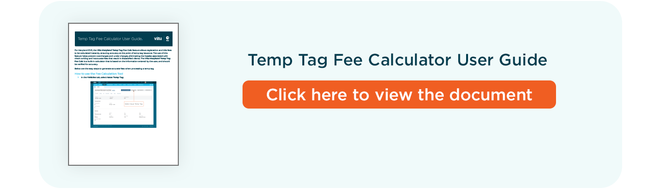 Say hello to accuracy with the new built-in Vitu Maryland Temp Tag Fee Calc available now. Instantly calculate registration and title fees at temp tag issuance. Built to help prevent over- and undercharges, this tool eliminates the hassles associated with check writing and keeps customers happy with accurate fees at the time of sale.