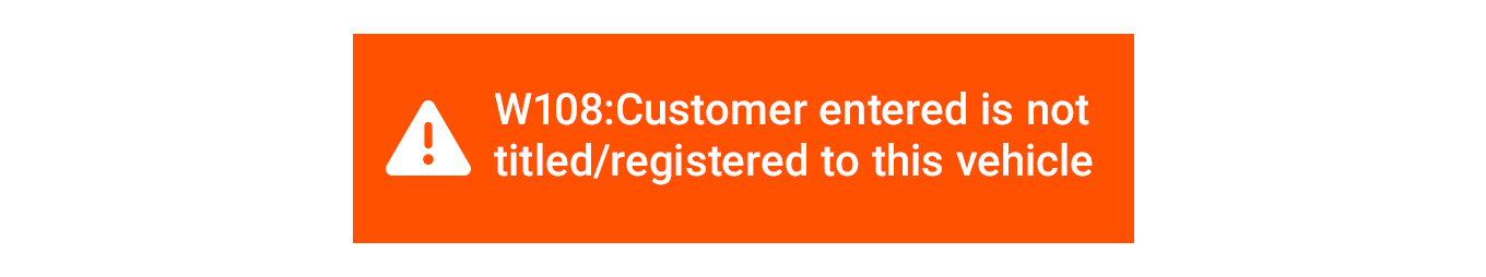 Processing organizations should reach out to the customer for verification upon receiving the following error message: W108: Customer entered is not titled/registered to this vehicle.