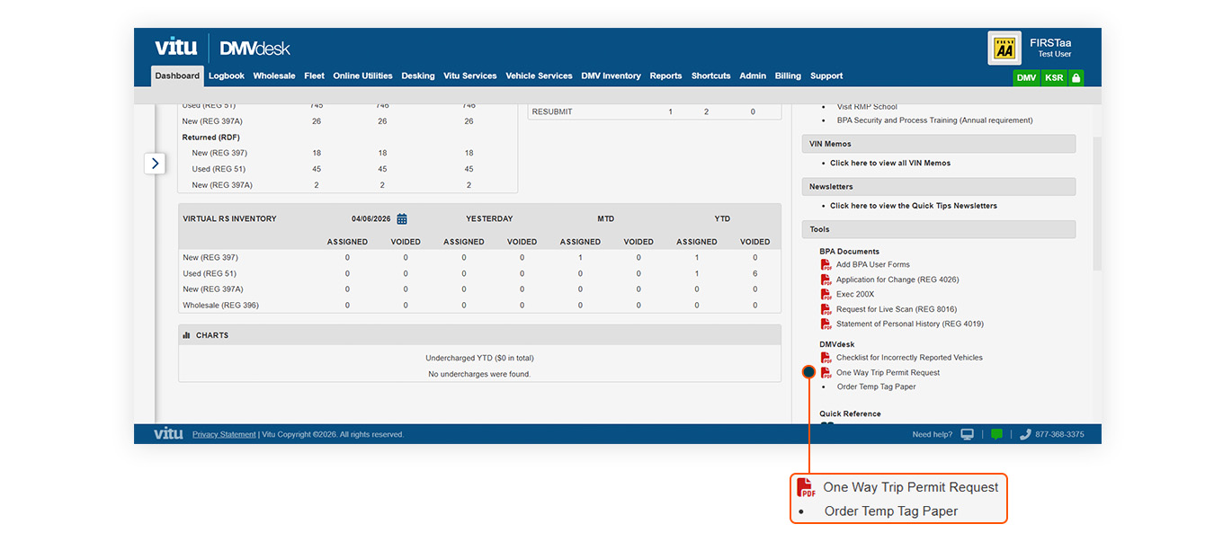 - One Trip Permits, Temp Tag Paper, and Emergency ROS books can be ordered from the Tools section of Vitu’s Dashboard tab.