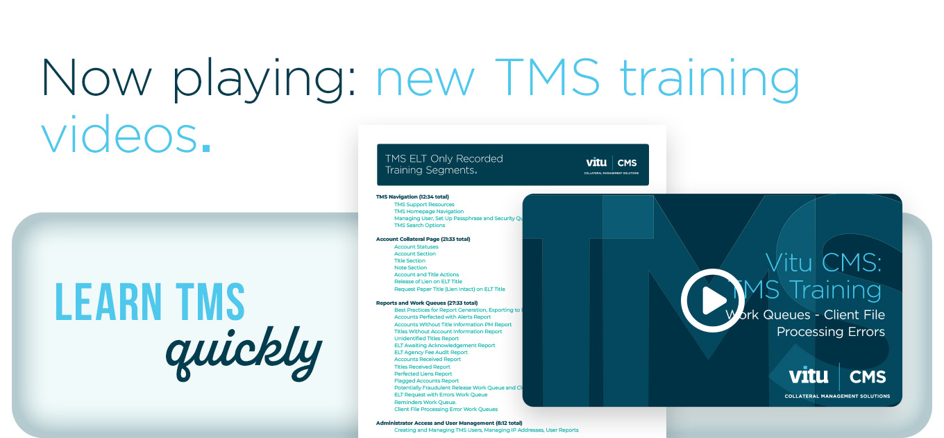 Are you puzzled on how to accomplish a particular task in TMS? We’re happy to offer you our new TMS training videos to help you with everything from setup and navigation to understanding the Account Collateral page, handling reports and work queues, and user management tips for administrators.