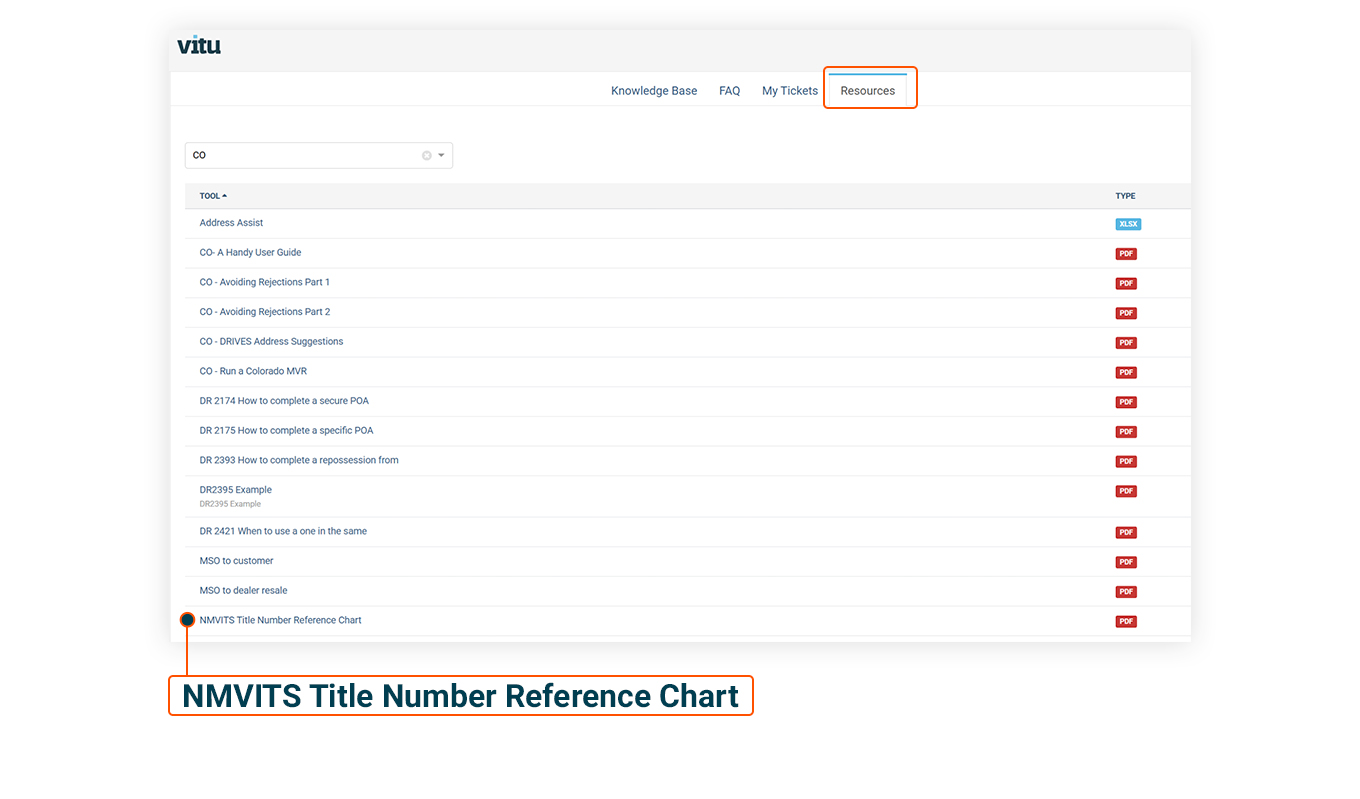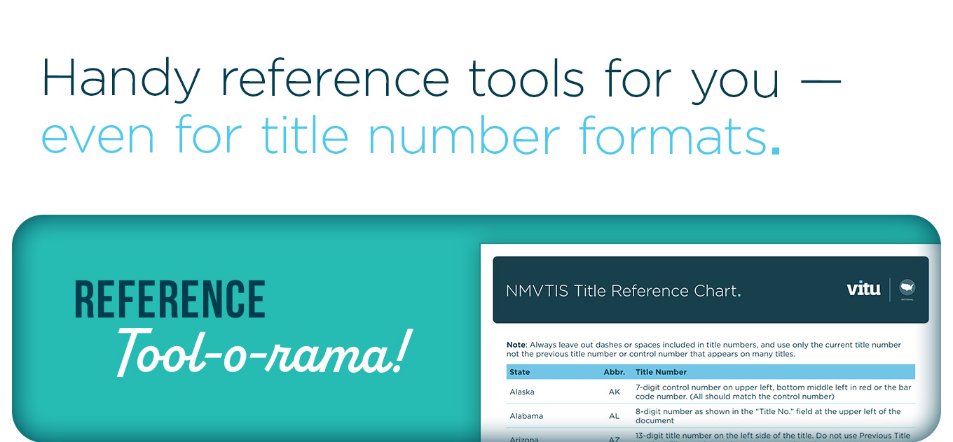 Did you know there are a number of reference tools for title clerks in Vitu? In particular, we want to call your attention to the amazing reference chart for out-of-state title number formats. The NMVTIS Title Number Reference Chart gives you information regarding all 50 states’ title numbers.