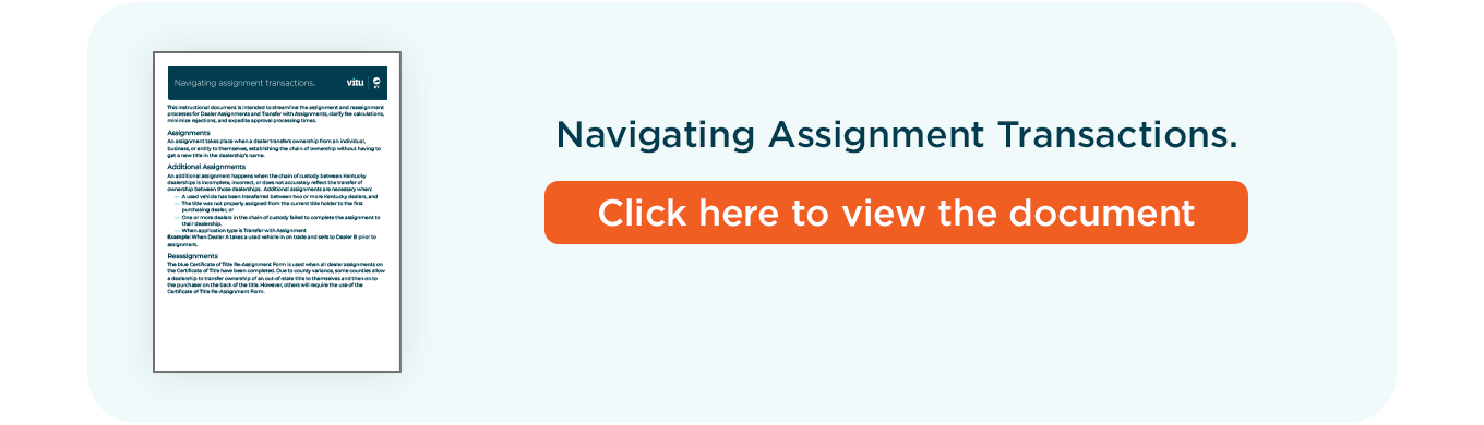 Integrated Transfer with Assignment transactions now require your dealership to be included in the chain of custody. To do so, select Add Additional Dealer Assignment and start typing your dealership name until it is located in the drop down box. Complete the date of transfer and the odometer reading, and the dealer license number should auto populate.