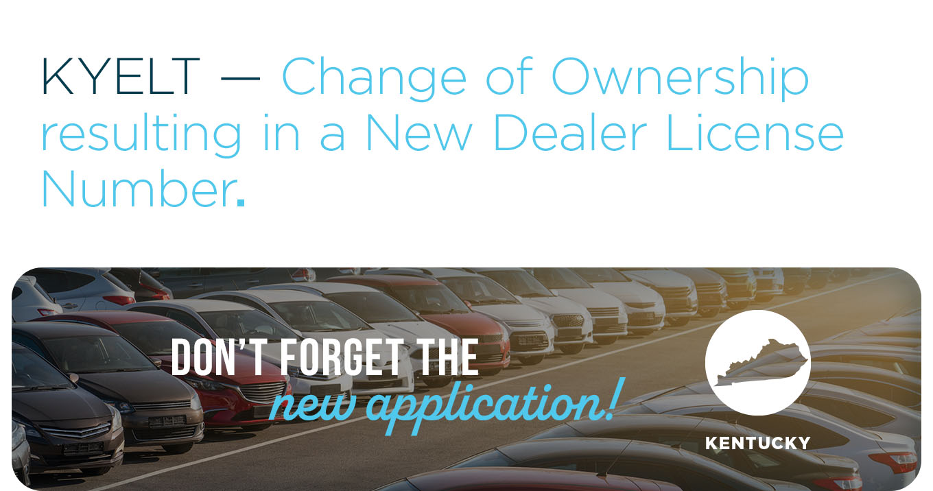 A change of ownership within your dealership that results in filing a new application with the Kentucky Motor Vehicle Commission also requires a new KYELT application to be submitted and approved by the Transportation Cabinet.
