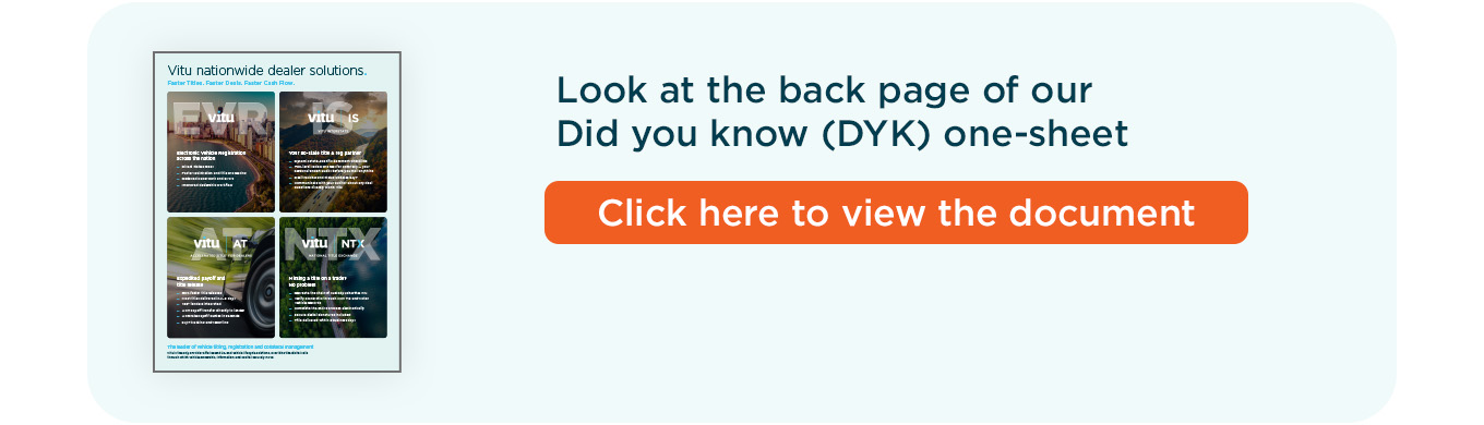 As your EVR partner, Vitu is here to help meet all your title and registration needs by removing barriers so you get deals done faster while providing your customers the level of service they expect.
