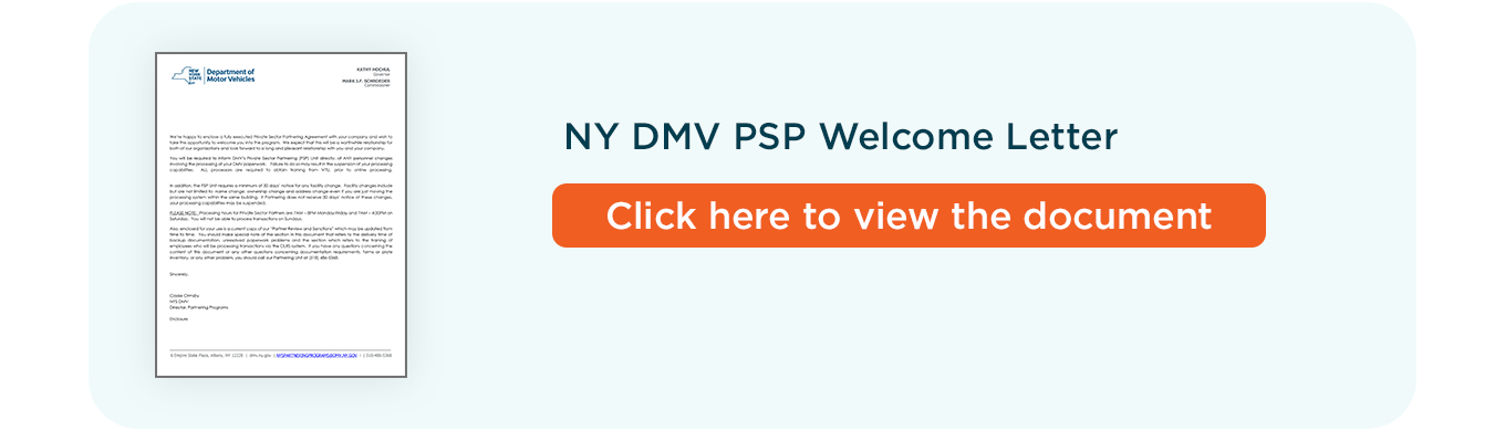 To ensure your business operates within DMV procedures and directives, the Private Sector Partnering (PSP) Agreement that your company signed gives the Department of Motor Vehicles (DMV) the option to discontinue support of your on-site registration system.