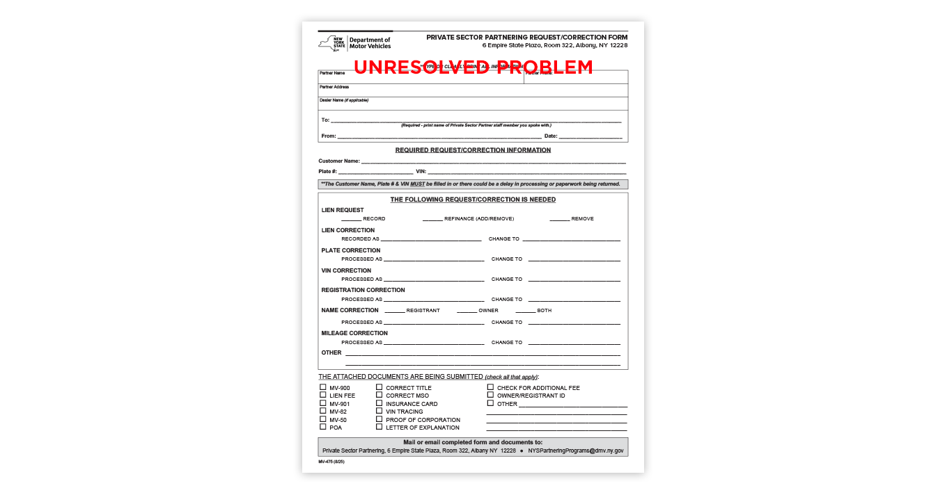 - Correction Sheets (MV475) — Correction sheets are needed for any paperwork that is sent into the PSP Unit that is not part of the original batch. If a correction sheet is not submitted, the partner will be notified. If the correction sheet is not received from the partner within one (1) week of notification, suspension will occur. Suspension will stay in effect until the MV475 is received.