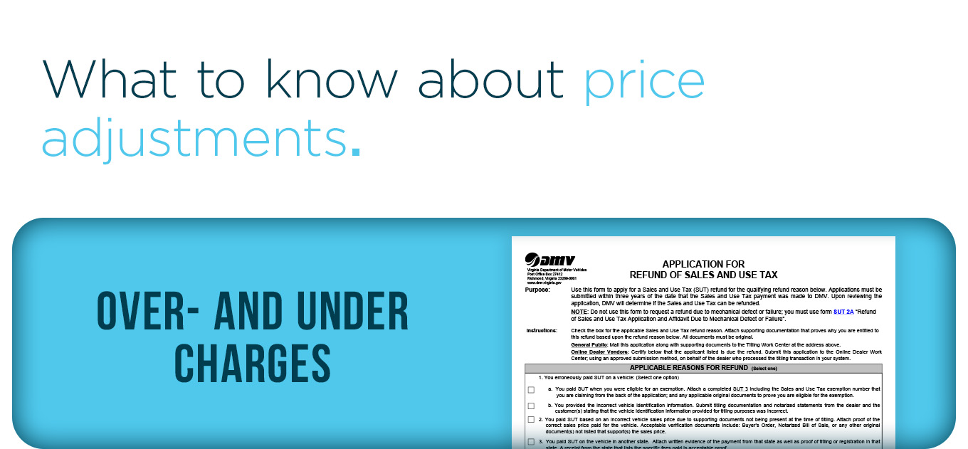 - Overpayments: Contact Online Dealer Services at 804-367-2715 to review the transaction. If additional funds are owed, the Virginia DMV will generate an invoice for the dealership to remit payment by check.